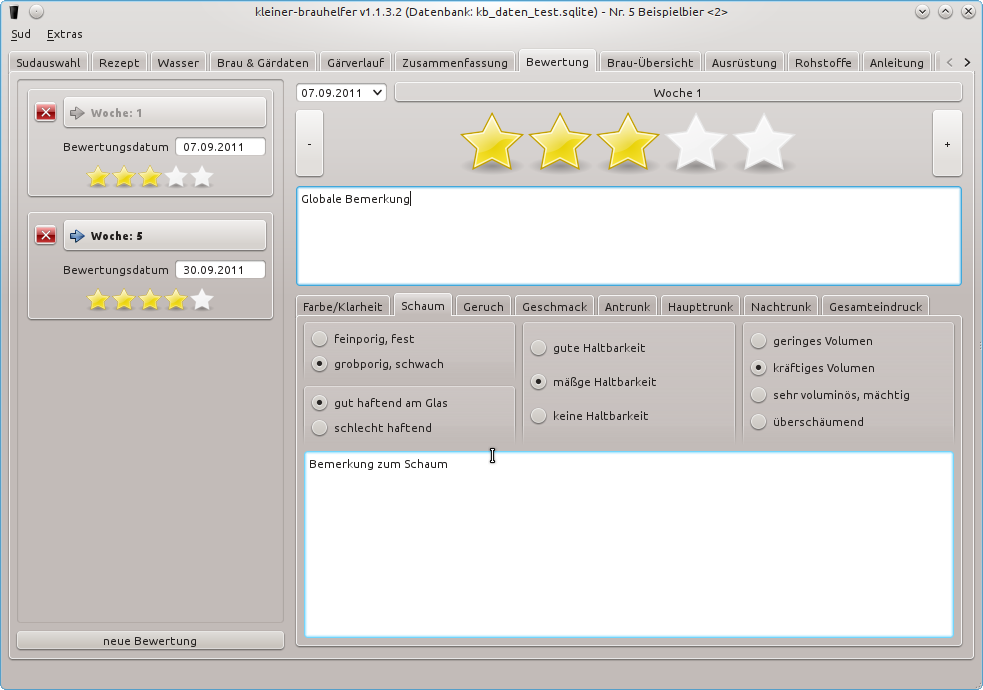 Im Tab Bewertung kann der Sud anhand der Sterneanzahl Bewertet werden, oder/und eine detaillierte Verkostungsnotiz eingegeben werden.