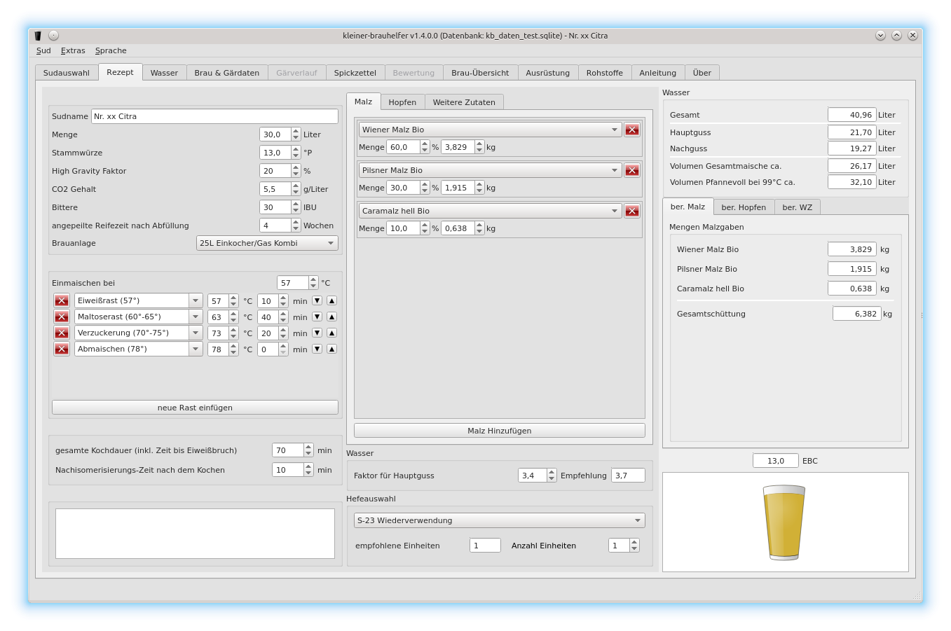 Auf der rechten Seite werden dann die berechneten Zutatenmengen und die zu erwartende Bierfarbe dargestellt.