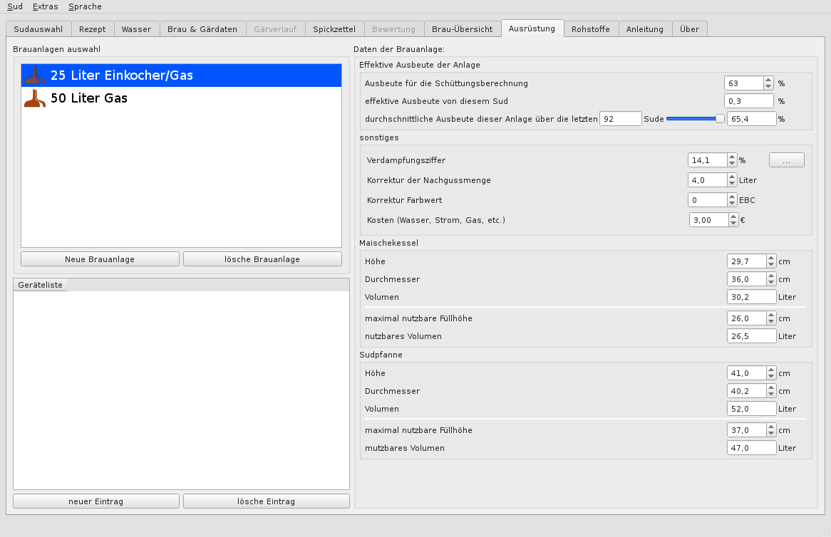 Hier können Geräte etc. eingetragen werden, die für den Brauvorgang erforderlich sind.
