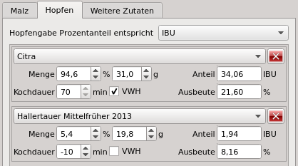 Es wird noch der IBU Anteil und die Ausbeute in % dieser Hopfengabe angezeigt.